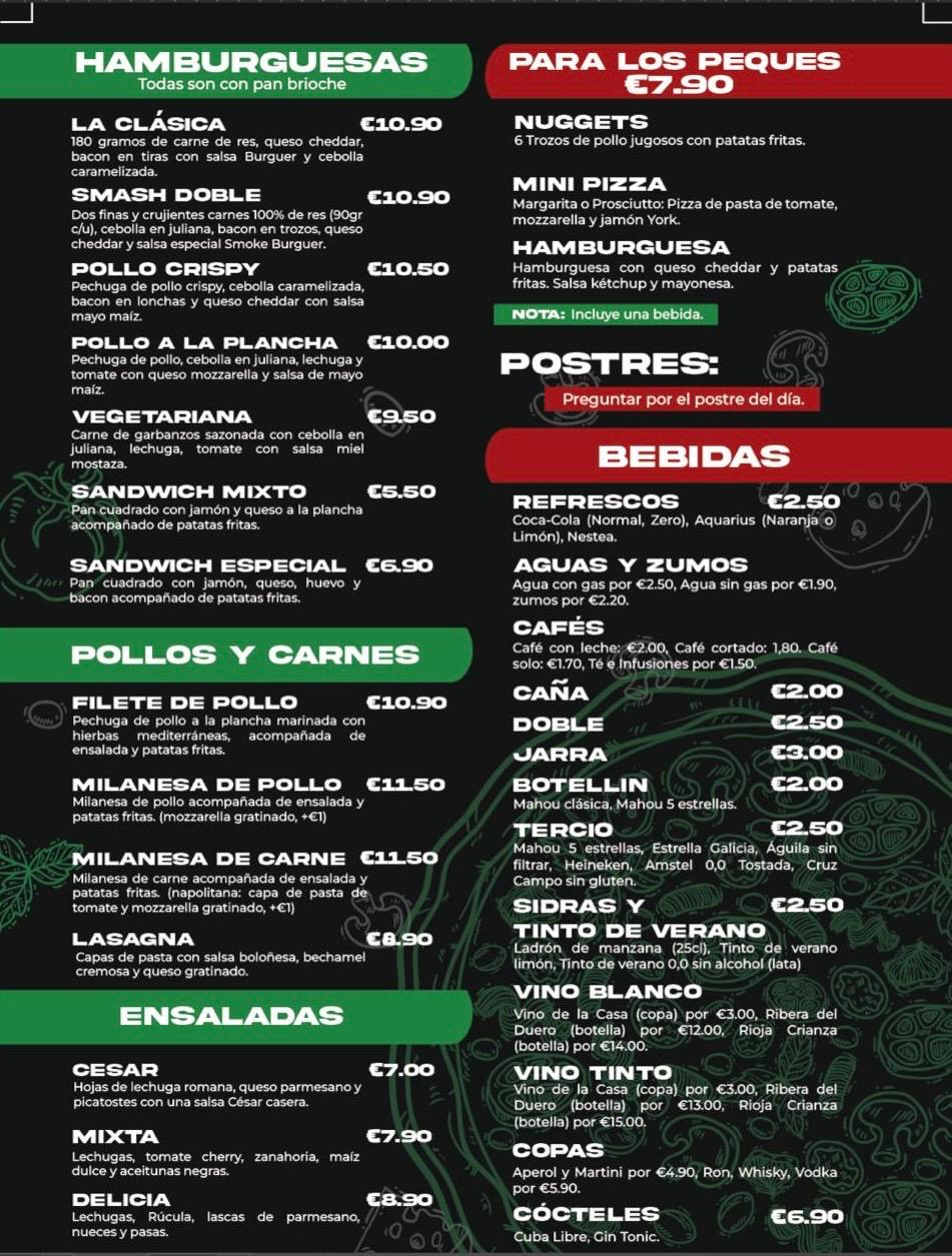 En nuestra carta encontrarás desde exquisitas pizzashamburguesas gourmet y lasañas, hasta milanesas crujientesensaladas frescas y una selección de entrantes irresistibles como patatas bravascroquetasgambas al ajillo, torreznos, tequeñosempanadas y otras delicias pensadas para compartir.